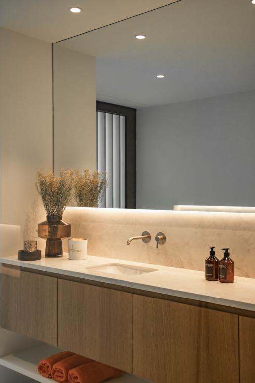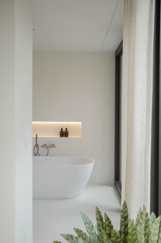 Eenmaal boven kom je in de centrale hal van de villa terecht. Hier bevindt zich een mastersuite met dressing en een zeer ruime privébadkamer, evenals nog drie slaapkamers die gebruik kunnen maken van een aparte badkamer. Daarnaast is er een apart toilet en een technische berging.