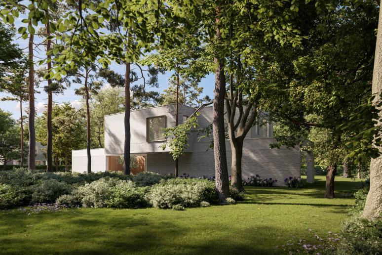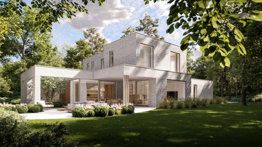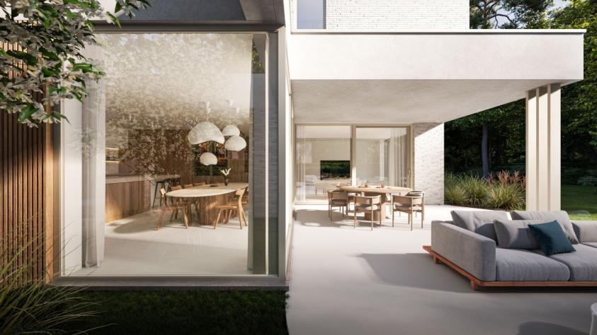 Vanuit het salon en de eetkamer heb je een prachtig zicht op de tuin met overdekt terras, die grenst aan een prachtige bosrijke omgeving. De tuin wordt aangelegd in samenspraak met de aannemer. De tuin heeft hoogstammig groen, waardoor de villa voldoende privacy heeft.