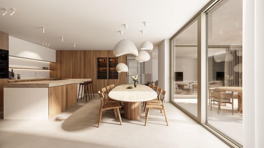 De architectuur van de villa is helemaal ontworpen rond de zichten op de verschillende patio's en de tuin. Hierdoor krijg je een uitzonderlijke woonbeleving! Via een eerste patio betreed je de inkomhal van de villa. Deze kan voorzien worden van een vestiaire en beschikt over een gastentoilet. We wandelen verder en bereiken rechts aan de tuinzijde het leefgedeelte, bestaande uit een salon en eetkamer met open leefkeuken. Vanuit alles ruimtes is er zicht op de tuin en het overdekt terras. Zie je jezelf al ontspannen in het salon en genieten van dat mooie uitzicht? heerlijk! Naast de keuken is er een ruime kamer die je kan inrichten als home office of speelkamer voor de kinderen. Een handige berging sluit eveneens aan bij de keuken en verbergt de technische installaties.