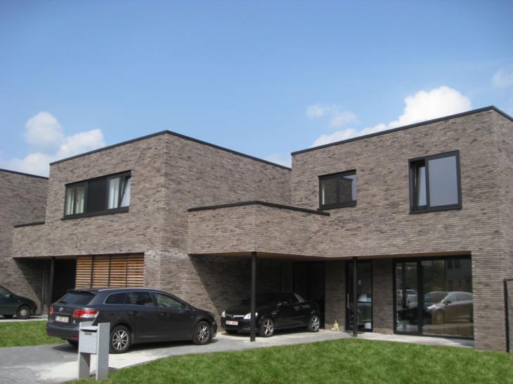 Het gevelsteenmetselwerk met gelijmd uitzicht draagt bij tot het moderne karakter van de woningen. De houten schuifpanelen brengen gefilterd licht binnen in de grote doorzon leefruimtes en zorgen tegelijk voor de nodige privacy.