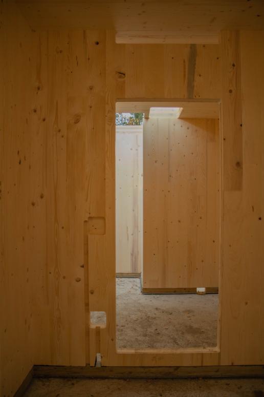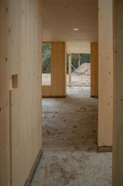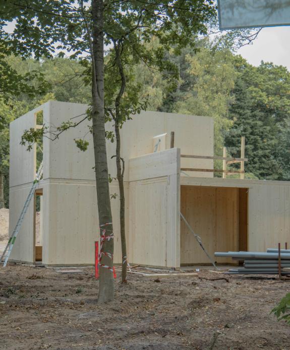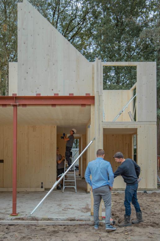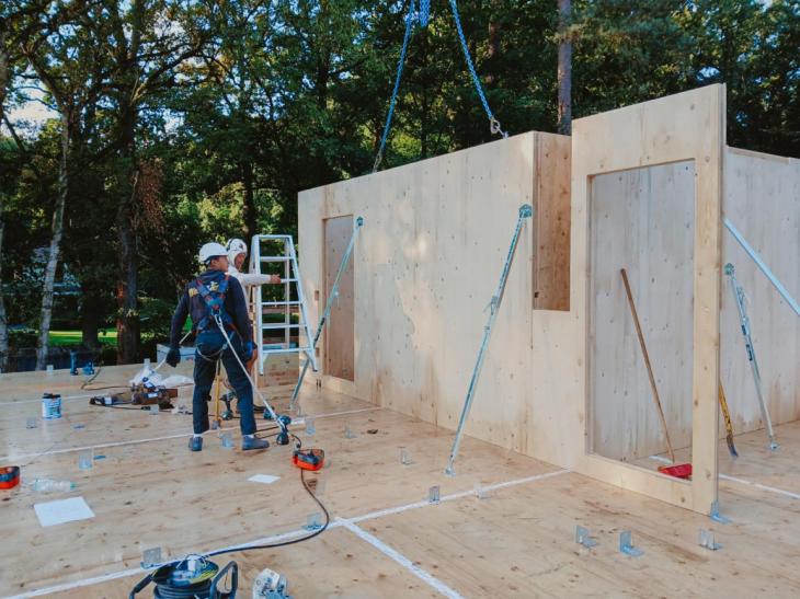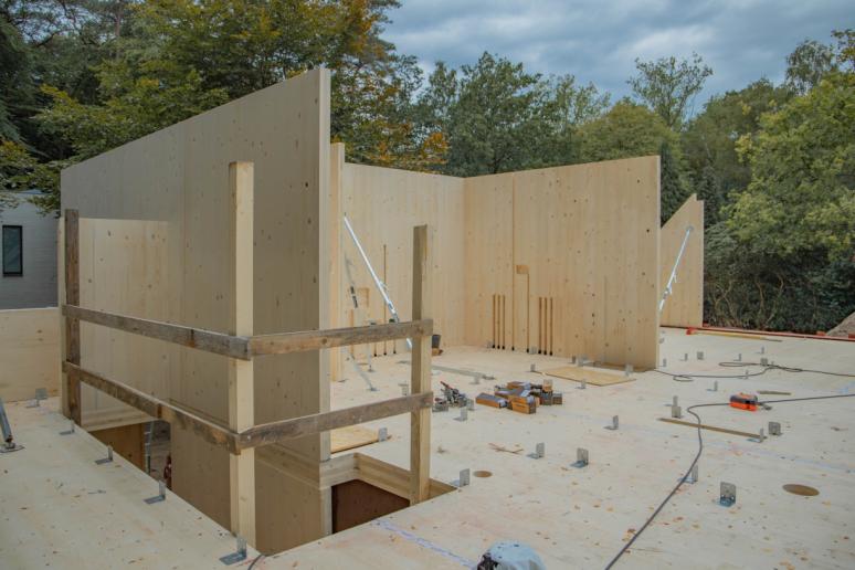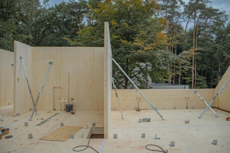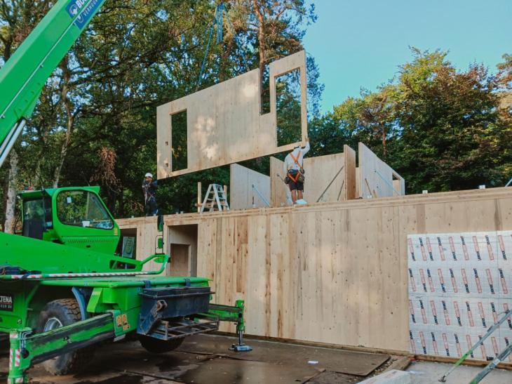 De CLT-constructie (Cross Laminated Timber) staat intussen overeind. Dit innovatieve houtbouwsysteem, opgebouwd uit massieve kruislings verlijmde houten panelen, combineert duurzaamheid met wooncomfort.